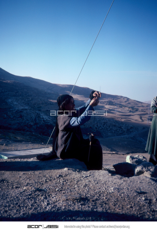 Jordan. Wadi Isal, Kathrabha (?), woman winding wool