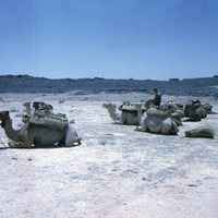 Jordan. Azraq fort (Qasr Azraq), camels near site