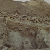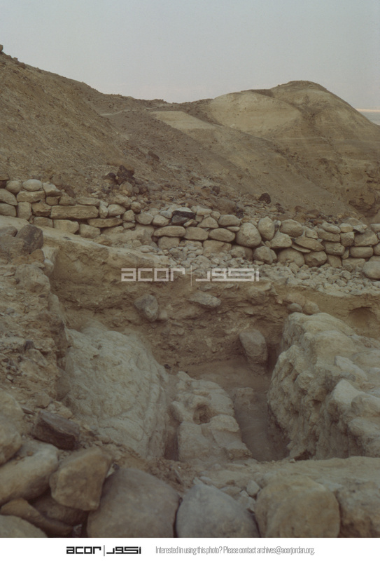 Jordan. Bab edh-Dhra‘ town site, Field XIV excavations, looking west at retaining wall to south post from father back