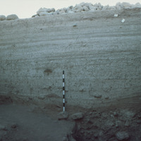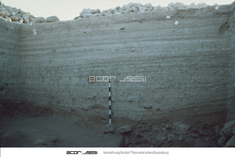 Jordan. Bab edh-Dhra‘ town site, Field IV.5 east balk, showing silt layers of 4,000 years built up over destruction debris in lower right