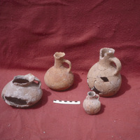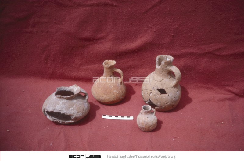 Jordan. Bab edh-Dhra' cemetery, roadside trench tomb pottery photographed at Karak. Jugs 20, 18, 09, 39