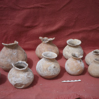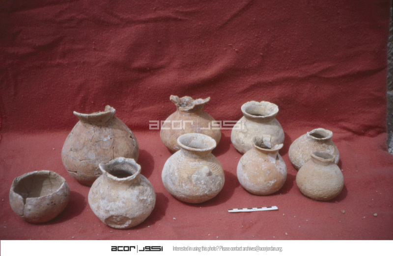 Jordan. Bab edh-Dhra' cemetery, roadside trench tomb pottery photographed at Karak. Small jars 30, 37, 45, 08 (back) and 10, 01, 19, 80, 77 (front)