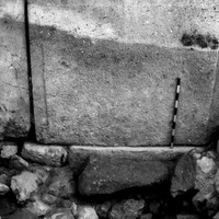 Jordan. Iraq al-Amir, square II.12, looking west at east wall. Foundation course at top of photo