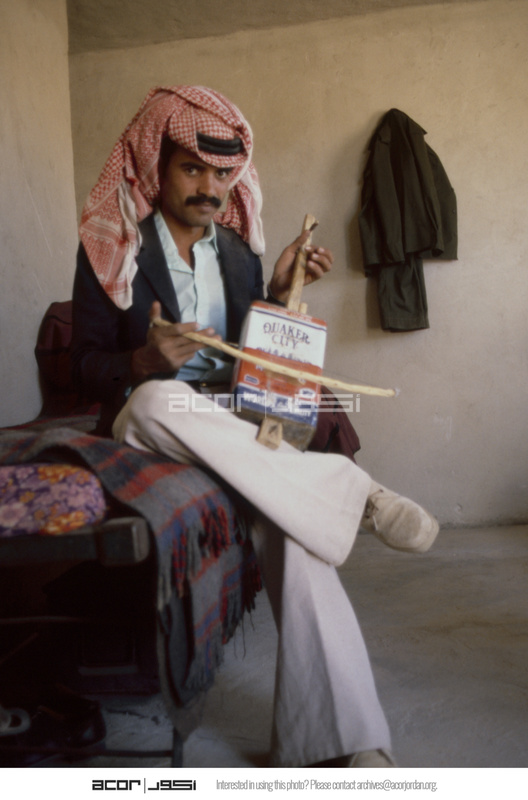 Jordan. Qasr al-Kharanah, man playing instrument made of Quaker city packet/tin