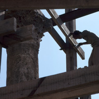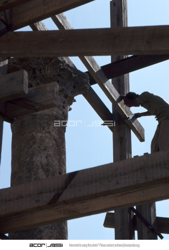 Jordan. Pella (Tabaqat Fahl), workman on wooden scaffolding surrounding column and capital