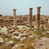 Jordan. Pella (Tabaqat Fahl), remains of pillared entrance courtyard from Byzantine period, (the Umayyad housing)