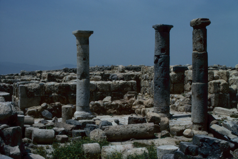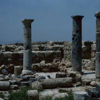 Jordan. Pella (Tabaqat Fahl), remains of pillared entrance courtyard from Byzantine period, (the Umayyad housing)