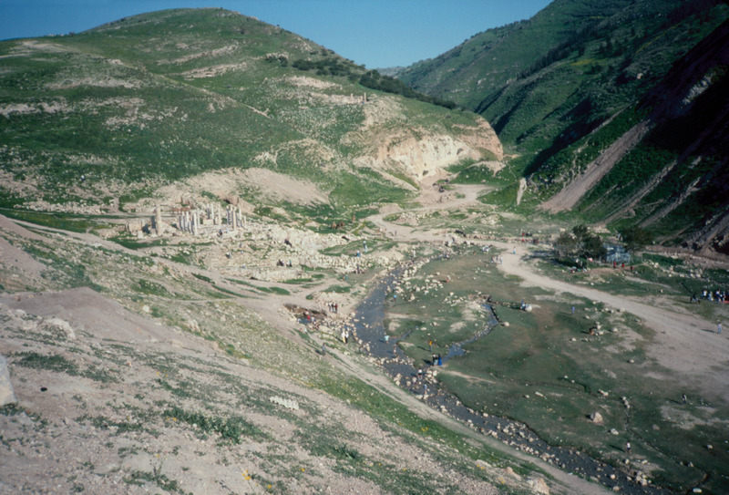 Jordan. Pella (Tabaqat Fahl), view from main mound to Wadi Jirm, showing Byzantine Civic Complex Church, monumental stairs and Odeon, with east church on hill above