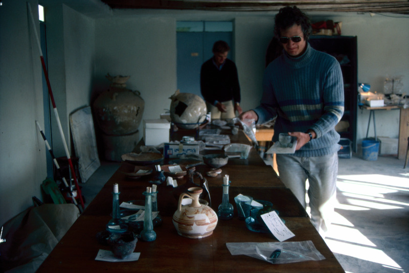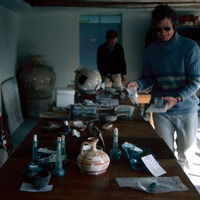 Jordan. Pella (Tabaqat Fahl), fine quality Hellenistic lagynos, or wine jug and glass vessels from a Byzantine tomb, Timothy Potts (background), Anthony McNicoll (foreground)