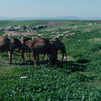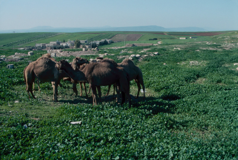 Jordan. Pella (Tabaqat Fahl), camels, spring vegetation