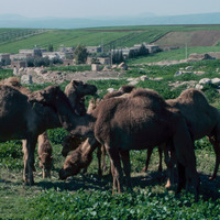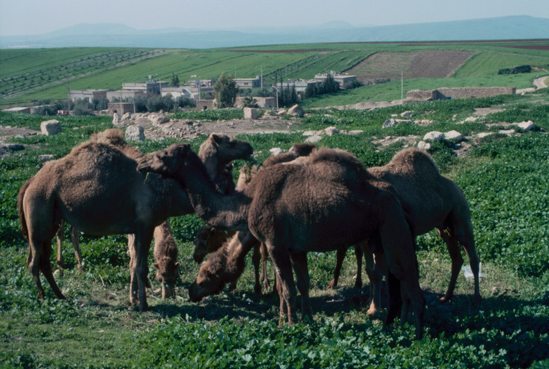 Jordan. Pella (Tabaqat Fahl), camels, spring vegetation