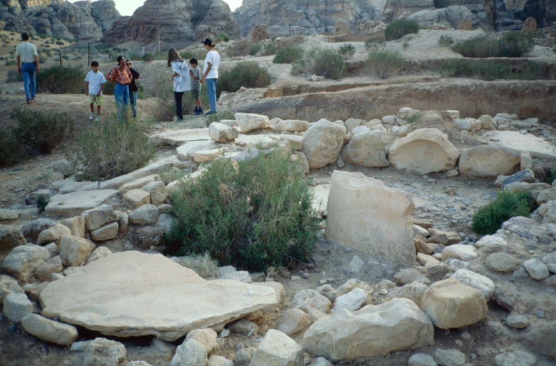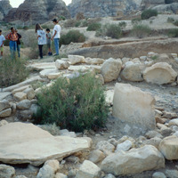 Beidha: The excavated Stone Age village of Beidha, one kilometer south west of Siq al-Barid, Beidha,the white one' in Arabic, dates from the period at the end of the Stone Age known as the Neolithic era, when people in the Near East making the slow, gradual transition from small groups of nomadic hunter-gatherers to settled villagers who domesticated animals and cultivated plants. It was excavated by Mrs. Diana Kirkbride. (Khouri, R. "Petra: a guide to the capital of the Nabataeans" 1986)