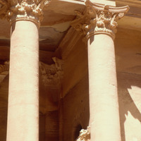 Jordan. Petra, Khaznet Far'oun (Treasury), detail of the trabeation of the lower order of columns, showing the delicate frieze of tendrils and volutes and the floral capitals with double rows of acanthus leaves
