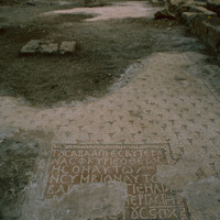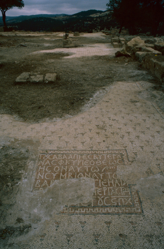1. An inscription on the mosaic floor of the church faces its west entrance. It is in white letters on a red background and displays an invocation to Saint Elijah. It asks the saint to bless Saba, the presbyter, and his wife. AD 622. (MacDonald, 2010)