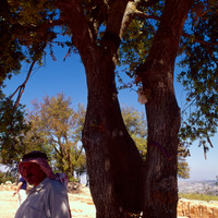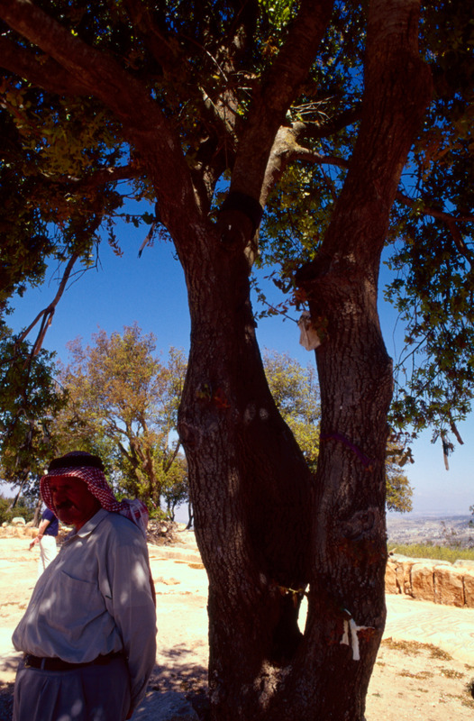 Jordan. Tall Mar Elias, tree with prayer ribbons, the many pieces of cloth tied to the site's trees have left by pilgrims who came to the site to ask for the assistance of God and Elijah