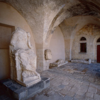 Jordan. Umm Qais (Gadara), cross vaulted sculpture hall in Beit al-Rusan, the statue of Tyche