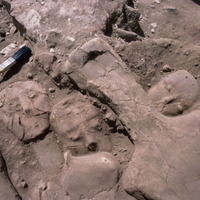 Gary Rollefson […] and Zeidan Kafafi […] were principal investigators […] ‘Ain Ghazal was first occupied around 7200 BC in the Pre-Pottery Neolithic and is one of the largest Neolithic sites in the Levant. Many animal and human figurines were recovered, but what remains the most extraordinary discovery there are the human statues and busts found in two caches: twenty-five in a group found in 1983 and dated to around 6750 B.C. and at least another ten from a slightly later cache discovered in 1985; this one contained three busts with two heads.