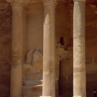 Jordan. Petra, Khaznet Far'oun (Treasury), lower order, north (right) man with camel