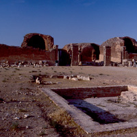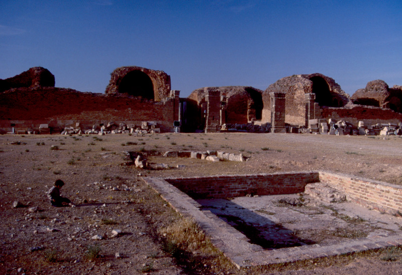 Jordan. Qasr al-Mushatta, within the walls of Mushatta, a small pool and the standing remains of the triple-apsed throne room and adjacent rooms