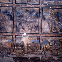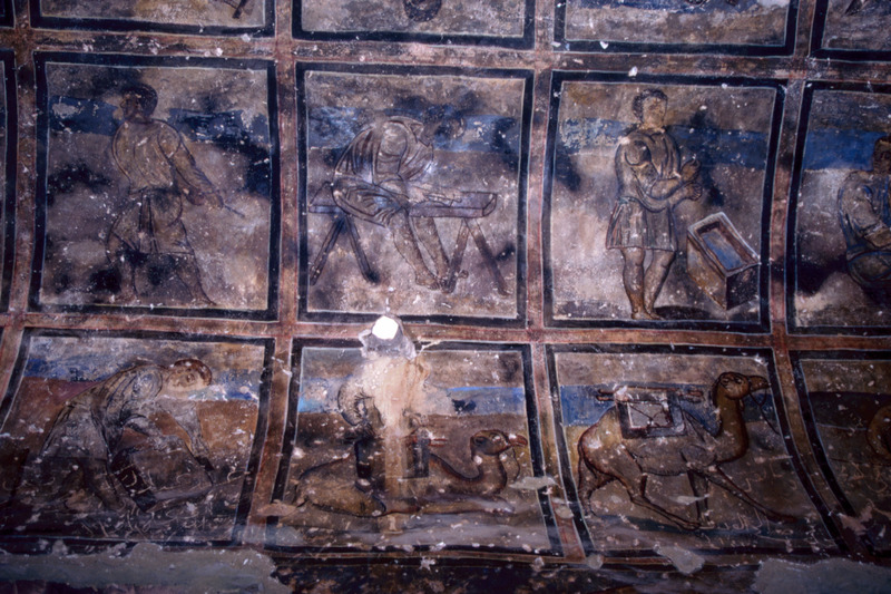 Jordan. Qusayr Amra, the decoration of this aisle is completed with the caissons which show craftsman's scenes: stonemasons, carpenters, blacksmiths and masons, representing the different stages of the construction of a building