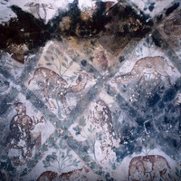 Jordan. Qusayr Amra, a gazelle sniffing and a bear is playing a three-stringed lute - مشهد لغزال تشتم ، ومشهد لدب يعزف على عود ذي ثلاثة أوتار
