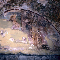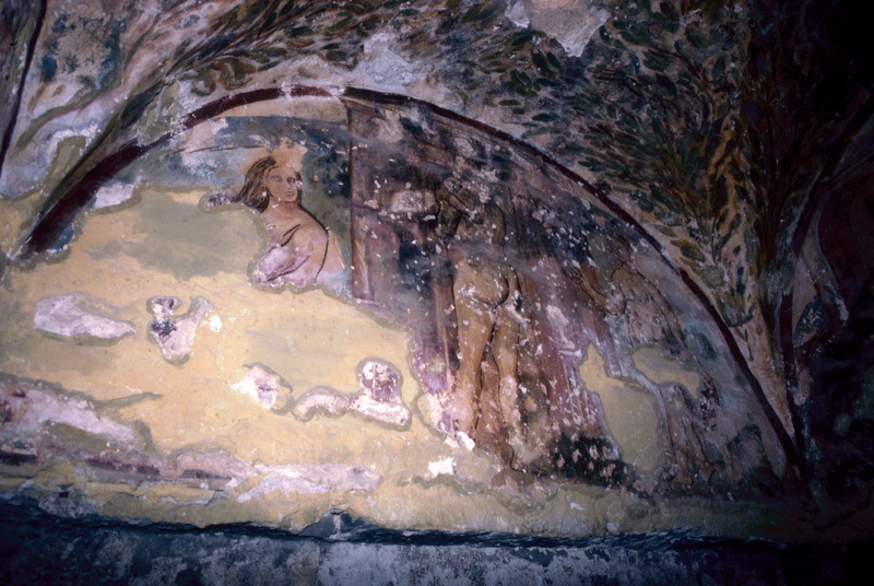 Jordan. Qusayr Amra, bathing scene with three female figures on an architectural background, the one on the right is approaching with a large vessel of hot water, while the one in the center holds a child