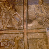 Jordan. Qusayr Amra, two caissons of the vault of the left aisle, with smithy scenes. The shading technique can be clearly observed.
