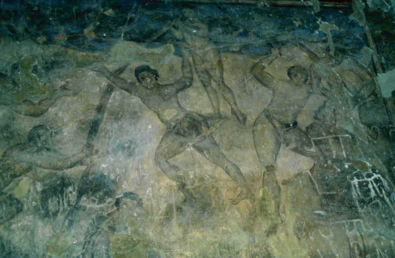 Jordan. Qusayr Amra, figure of a young man in a wrestling position in the arena scene