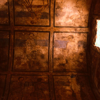 Jordan. Qusayr Amra, general view of the vault of the left bay, with artisan scenes. On the upper part, the decorative arrangement of the soffit of the arch which leads into this aisle may be observed, with the female figures holding a medallion