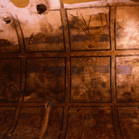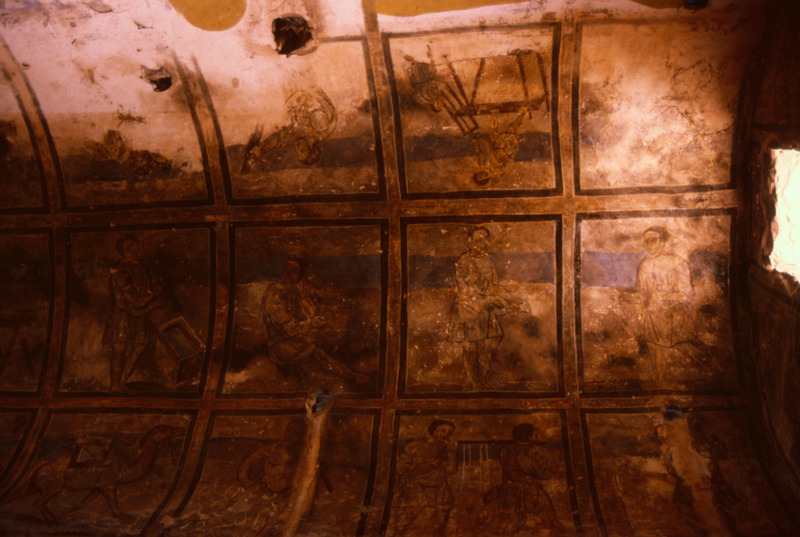 Jordan. Qusayr Amra, general view of the vault of the left bay, with artisan scenes. On the upper part, the decorative arrangement of the soffit of the arch which leads into this aisle may be observed, with the female figures holding a medallion