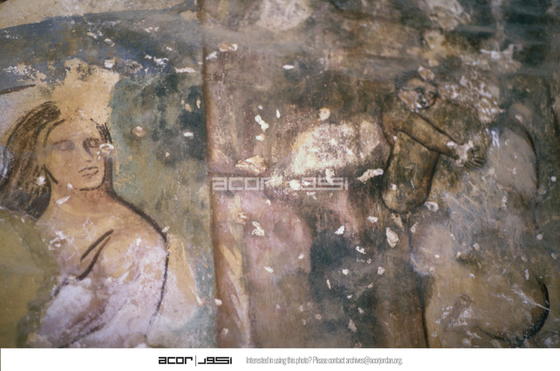 Jordan. Qusayr Amra, detail of a female figure holding a child on the S. tympanum of the women's "caldarium"