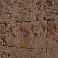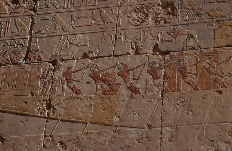 Egypt. Deir al-Bahri, Hatshepsut Temple, painted relief carving of oarsmen