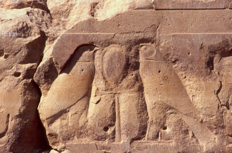 Egypt. Thebes, Colossi of Memnon, relief of two falcons and ankh
