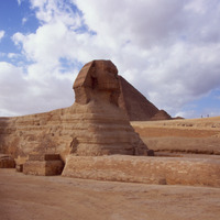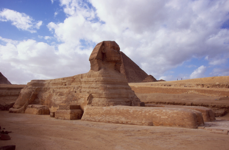 Egypt. Giza, Sphinx with Great Pyramid of Khufu behind