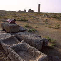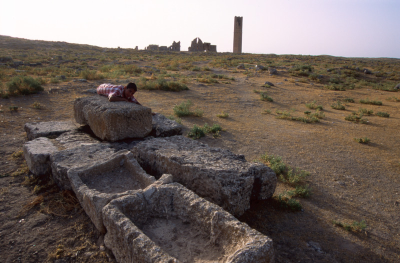Turkey. Harran, well in ruins of ancient city, 8th century mosque in background