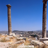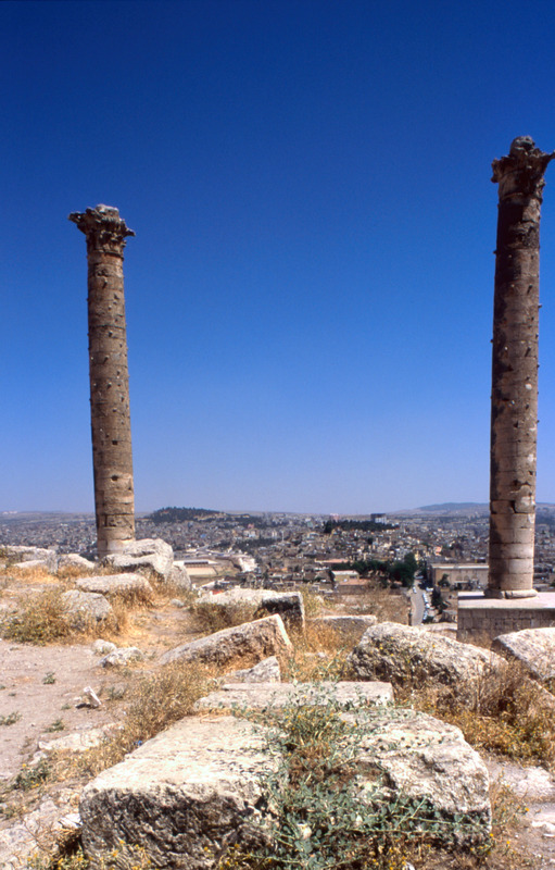 Turkey. Urfa, two columns and Corinthian capitals on citadel, from south