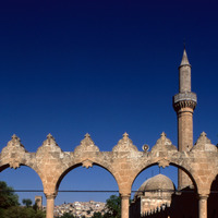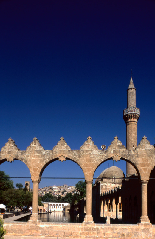 Turkey. Urfa, Abraham's pool, seen through arches at east end