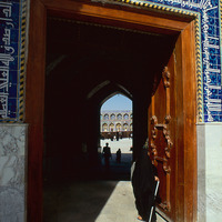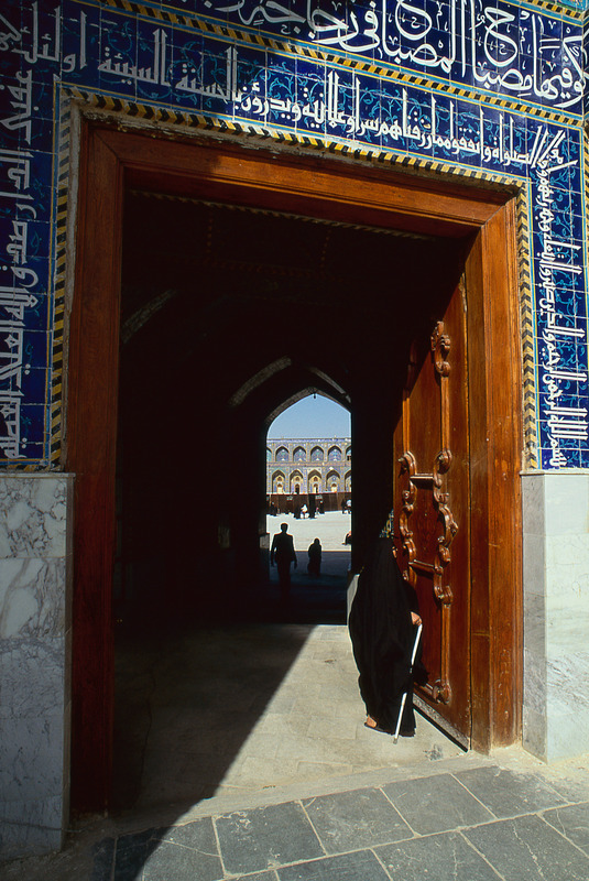 Iraq. Kerbala, woman in antrance to Shrine of Imam Hussein restored after damage during uprising of March 91