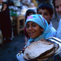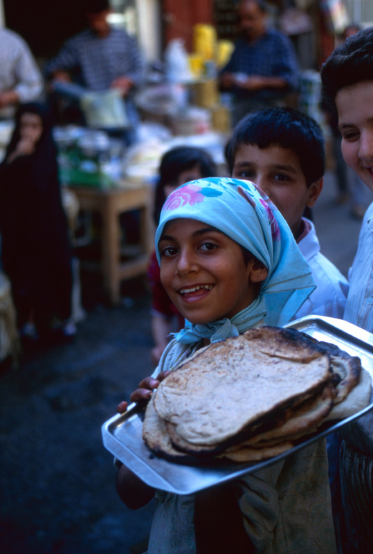 Iraq. Baghdad, girl carrying bread in street market