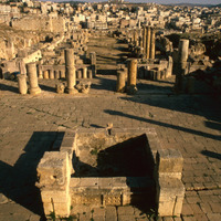 Jordan. Jerash, The Fountain Court with the ruins of the Cathedral beyond