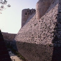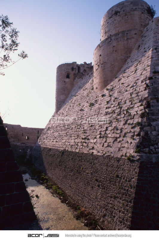 Syria. Krak des Chevaliers, 12th century Crusader castle, moat and towers