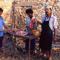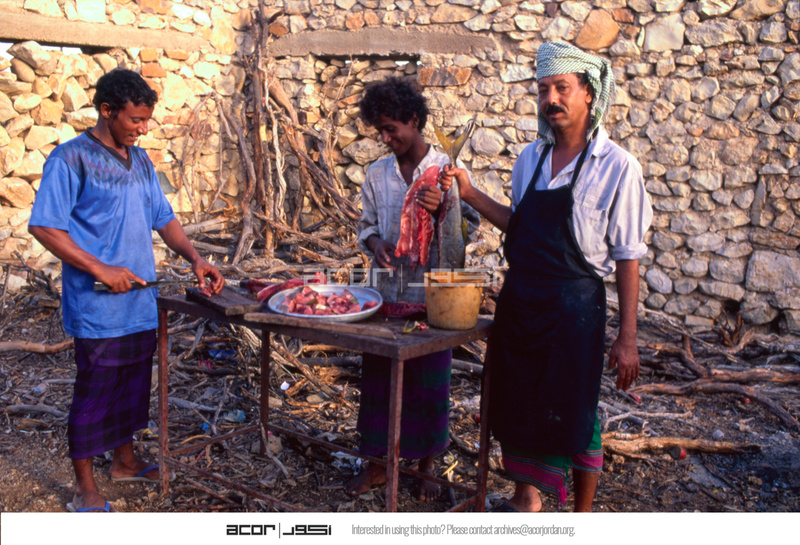 Yemen. Socotra, Hadibou, men preparing salt fish