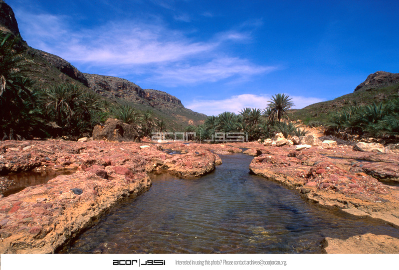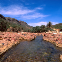 Yemen. Socotra, stream and granite rocks, limestone mountains