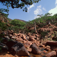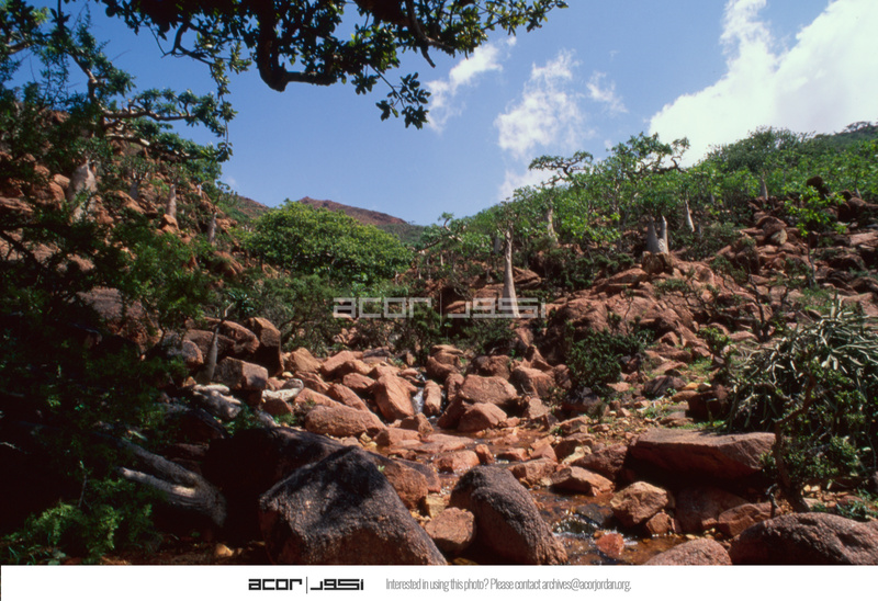 Yemen. Socotra, mountain stream and bottle trees (Adenium socotranum)