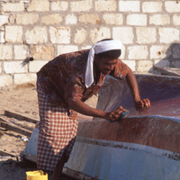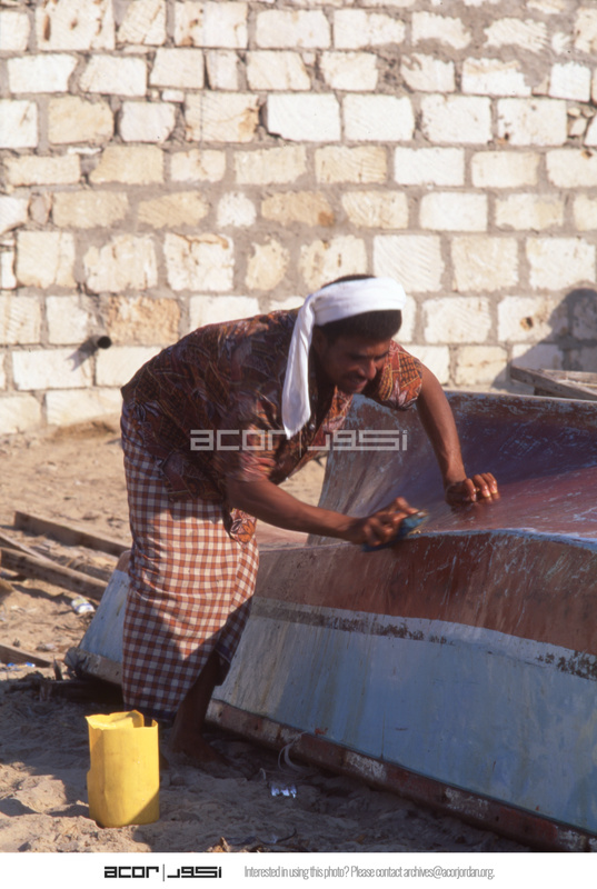 Yemen. Ash-Shihr  fisherman cleaning boat