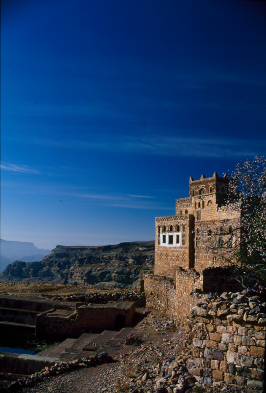 Yemen. Kawkaban, near Sana'a, house and almond blossom