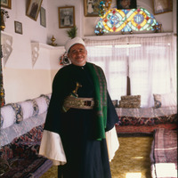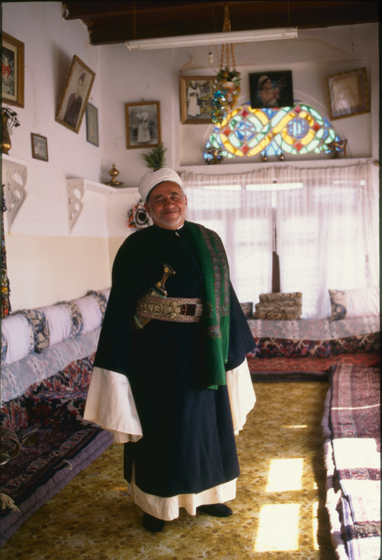 Yemen. Sana'a, Sheikh in sayyid's black robe, sleeves down for mosque