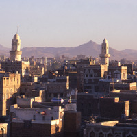 Yemen. Sana'a, minarets of Great Mosque & old houses