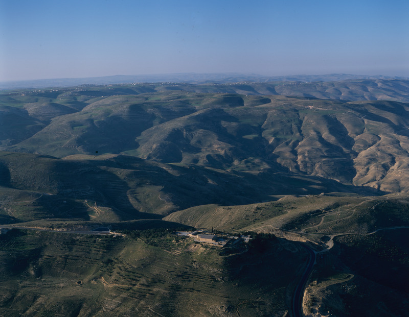 Mount Nebo, Memorial of Moses, from north, with hills in background