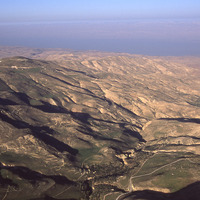 Hills and wadi north of Mount Nebo, Dead Sea in background